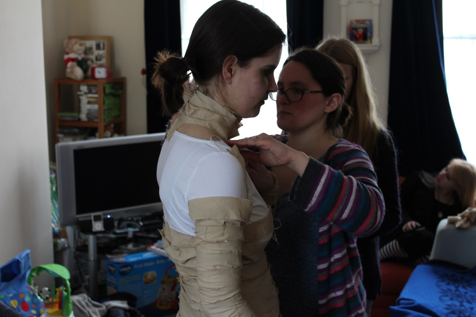 We started with a scene that was eventually cut for time. Time in the film, and lack of time to create the effects needed. However all I remember was sitting on the bathroom floor, squashed up against the wall trying my hardest not to break down into laughter. I failed. How unprofessional of me.